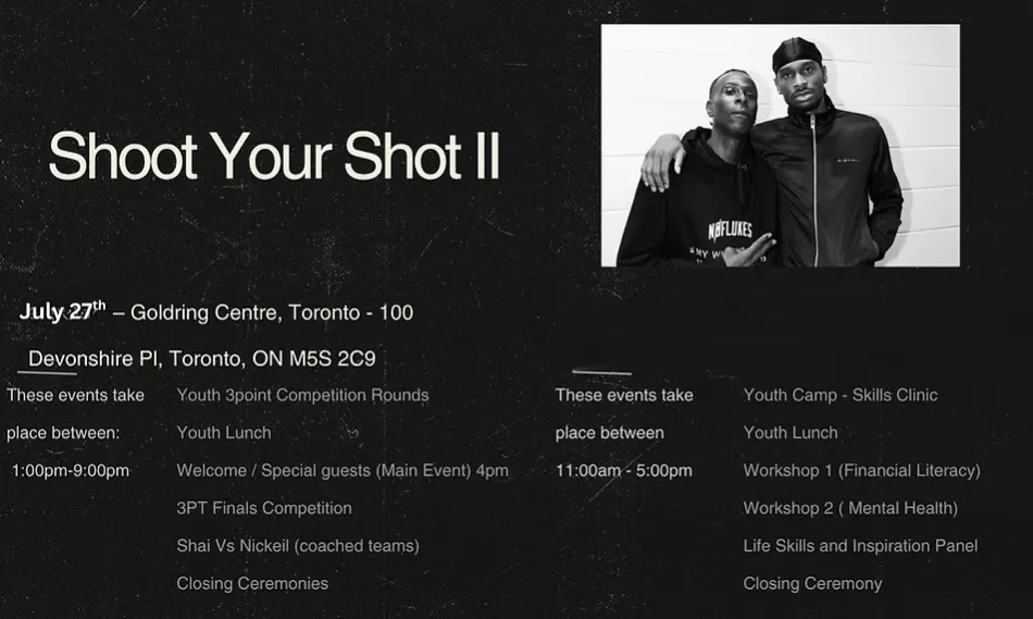 "As the flagship charity basketball event in Toronto, 'No Flukes' Shoot Your Shot 2024 marks the beginning of an impactful legacy. Our mission this year is simple: To enroll 100 young talents into basketball programs across Canada and distribute over 100 backpacks to our city's youth. Through 'Shoot Your Shot,' our vision extends beyond a mere hoop; we aspire to establish an enduring tradition of support for Toronto's youth, enriching lives year after year. Join us in our endeavor to uplift our community and empower the leaders of tomorrow."